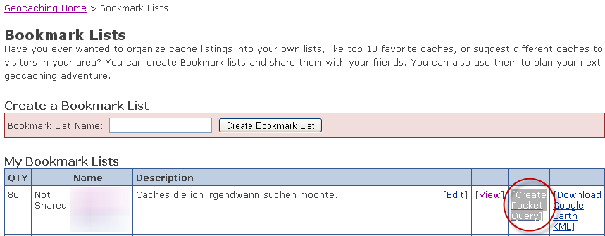 24. Geh in die Liste Deiner Bookmarks und klicke in der zweitletzten Spalte auf [Create Pocket Query] Der Rest ist dann gleich wie bei einer normalen Pocket Query: Du bekommst schlussendlich ein gpx-File dass Du einfach aufs Orgeon ziehen kannst.